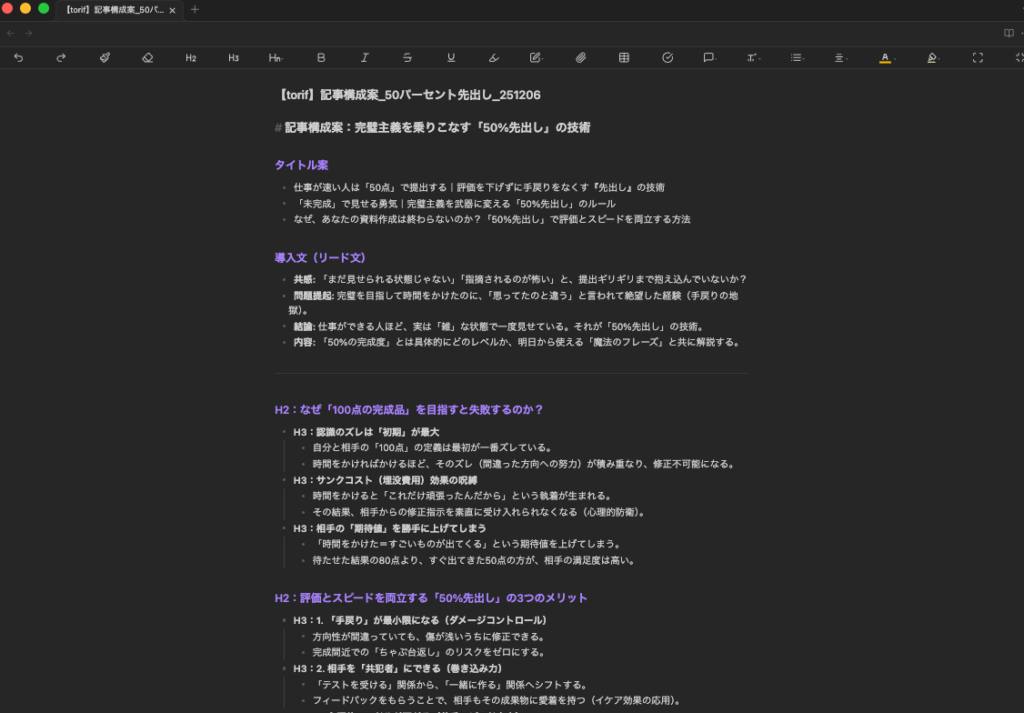 まずは、手書きのメモや、テキストエディタでの「見出し構成(H2, H3)」だけを作り、「この記事構成で読者の悩みは解決できそうですか?」と確認するのです。