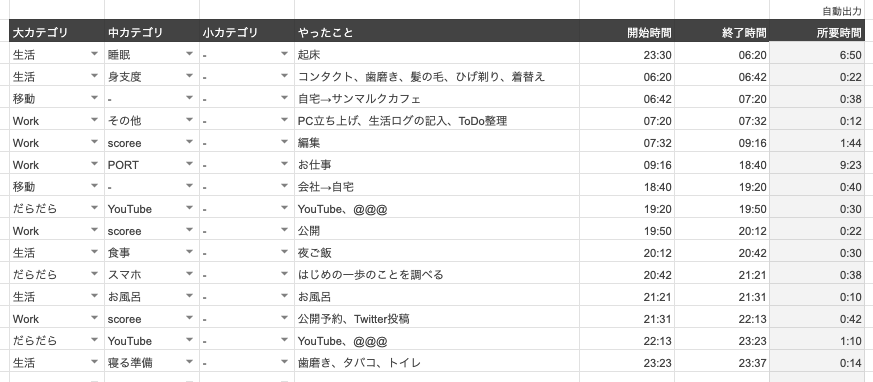- カテゴリに分類する(生活/だらだら/Work/遊び/移動 など)