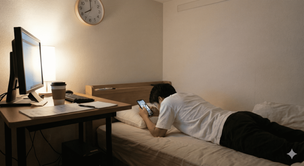 僕の部屋は1Kで、デスクのすぐ近くにベッドがあります。仕事に疲れて「ちょっと休憩」と思ってベッドに寝転ぶ。そしてスマホを手に取り、TikTokを開く。