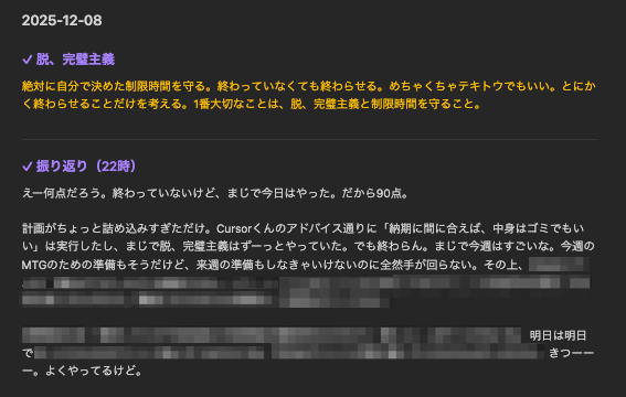 でも今は、毎日の自己採点と工数ギャップ分析のおかげで、自分の「感覚」と「事実」のズレに気づけるようになりました。
