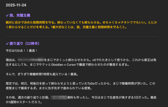 この記事では、僕が実際に運用している「自律型成長システム」の全貌を公開します。ObsidianとCursor(AIエディタ)を使って、毎日の振り返りを仕組み化し、週次でAIにフィードバックをもらう。